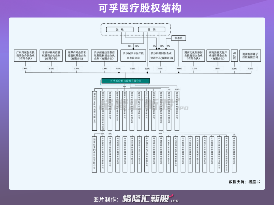 从股权结构来看,可孚医疗实际控制人为张敏聂娟夫妇,前者为公司董事长、总裁,后者为副董事长。本次IPO之前,二人通过直接和间接持有,共同控制公司72.31%股权。本次发行后,二人持股将降至54.23%。