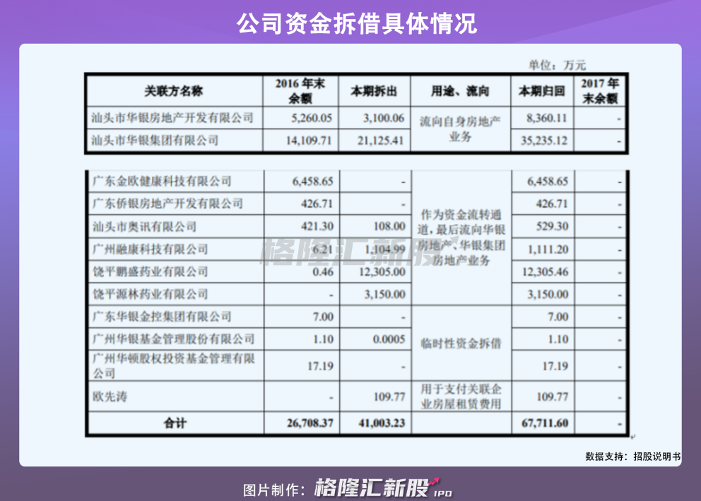 2017年,实际控制人旗下的华银房地产、华银集团、侨银房地产等关联方因经营业务需要,与公司发生资金拆借。仅2017年,粤万年青便出借4.1亿元,加上2016年末的拆借资金2.67亿元,合计约6.77亿元。