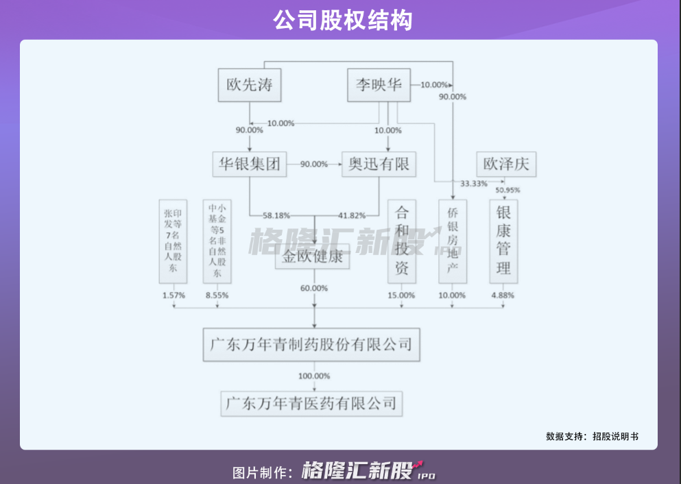 粤万年青前身广东省汕头制药厂成立于1981年3月,经过整改后,变更为“广东万年青制药有限公司”。IPO前,金欧健康持有公司60%股份,为其控股股东;实际控制人欧先涛、李映华夫妇间接持有公司71.63%。除此之外,合和投资、侨银房地产持股占比均超过5%。