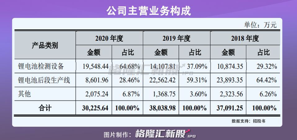 锂电池设备检测和锂电池后段生产线是瑞能股份的主要收入来源,其他收入为储能相关。招股书显示,2018年至2020年,瑞能股份锂电池检测设备营收占比由30%增长至65%,而后段生产线营收占比则明显减少,因为新能源汽车产业政策方面,补贴退坡幅度较大,以至于锂电池后段生产线订单相应减少。