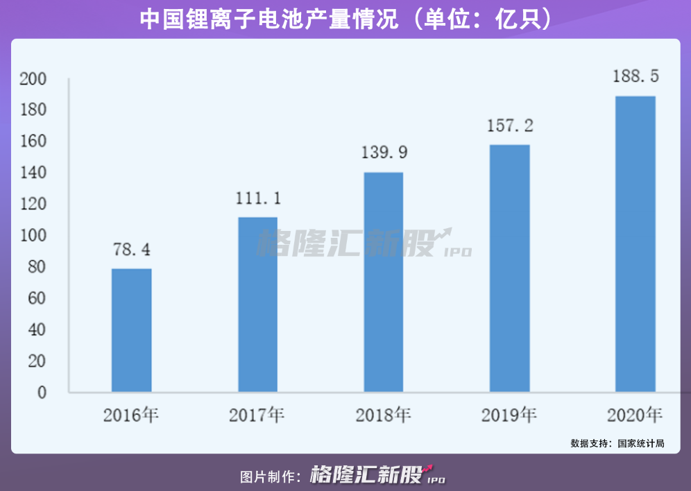 随着新能源车行业的快速发展,锂电池的需求量得到大幅增长。2016年-2020年,锂电子电池产量的复合增长率为24.52%,2020年较2019年增长19.91%。