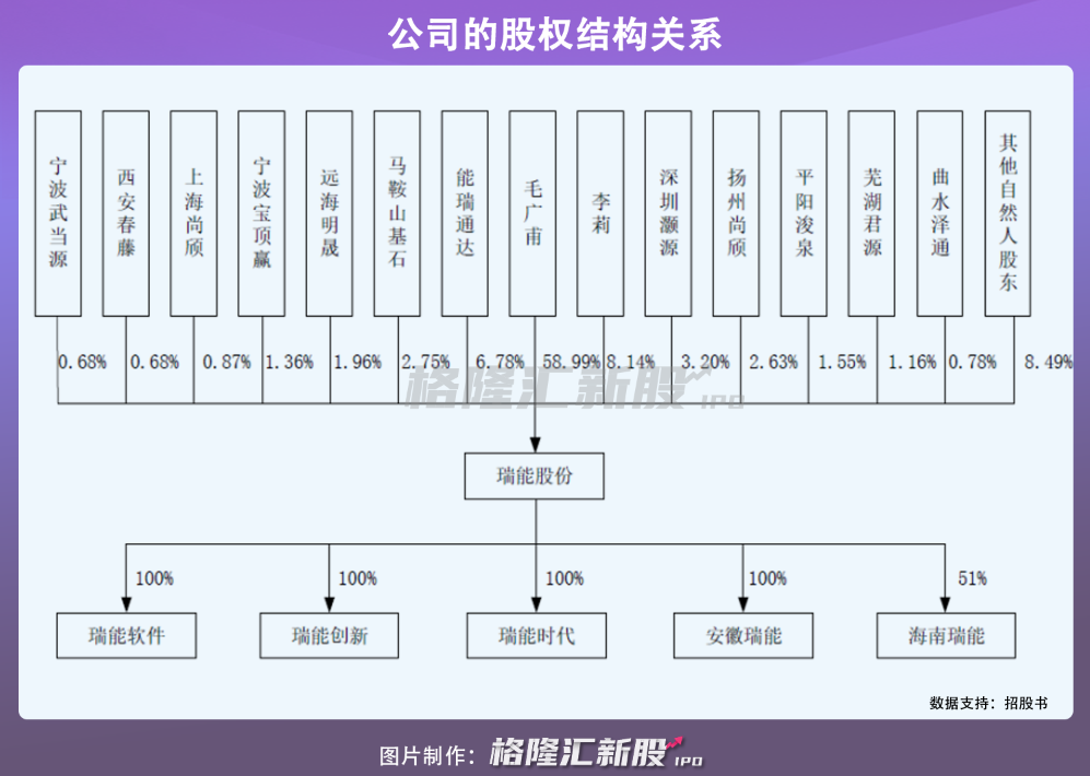 从公司的股权架构来看,控股股东、实际控制人为毛广甫、李莉夫妇,二人直接和间接合计持有公司73.90%的股份。此外,持有公司5%以上股份的股东,只有能瑞通达,6.78%。