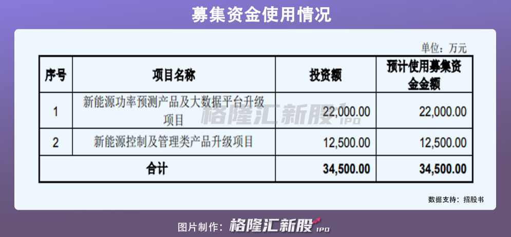 本次IPO拟募集3.45亿元,主要用于新能源功率预测产品及大数据平台升级项目、新能源控制及管理类产品升级项目。