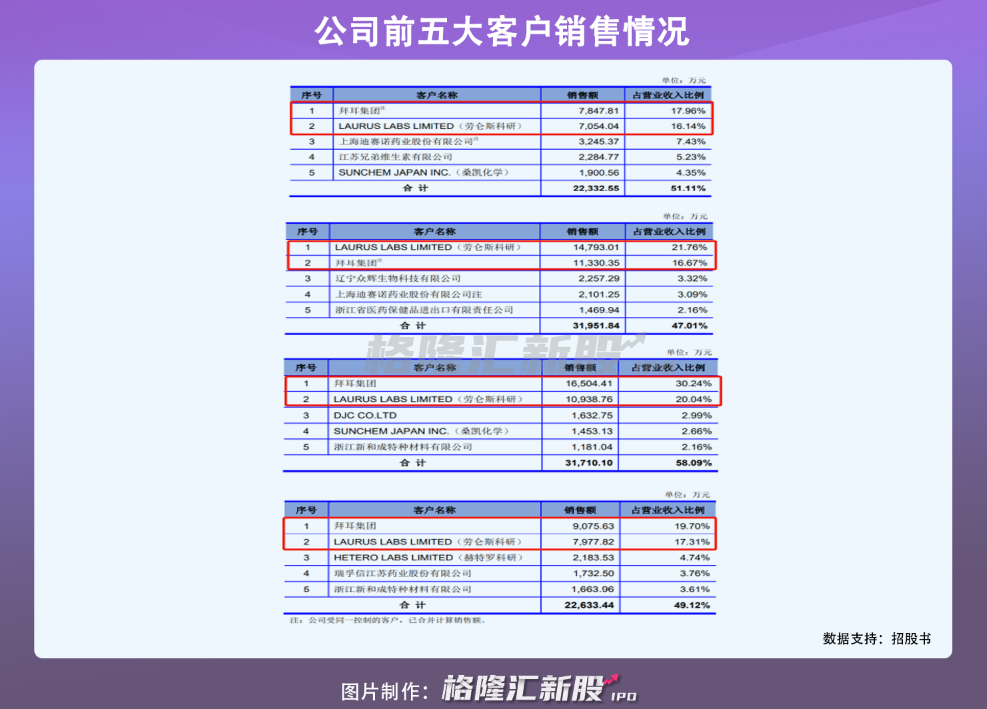 与此同时,因联盛化学的最终客户主要集中在国外,且报告期内,其向前五大客户的销售收入占比分别为 49.12%、58.09%、47.01%和 51.11%,而同行业前五大客户销售收入占比20%-25%之间,公司客户集中度相对较高。其中公司向拜耳集团及劳仑斯科研两家客户销售收入占比合计为37.01%、50.28%、38.43%和 34.10%。公司销售收入对上述主要客户形成一定依赖。若未来主要客户产品市场竞争加大或者相关产品的替代竞品出现,导致需求下降,减少了对联盛化学的采购订单规模,公司持续经营能力将产生不利影响。