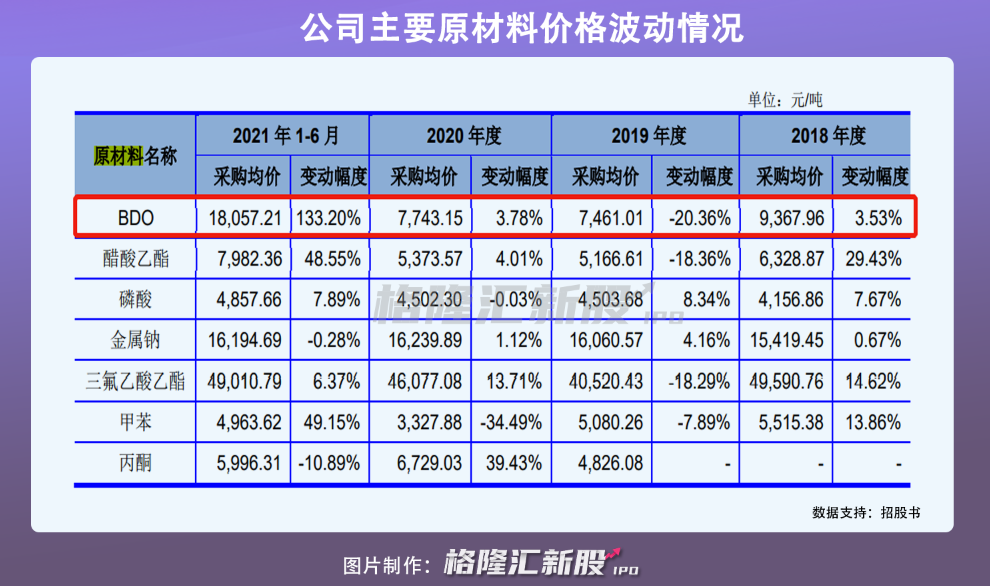 值得一提的是,由于公司原材料成本占生产成本的比例均值在80%左右,自2020年以来,其主要原材料代表BDO受PBAT需求拉动、供应紧张,采购均价上浮,从2020年的7743元/吨,大幅增至2021年上半年的1.81万元/吨,并预计未来依然保持高位运行。联盛化学一定程度上或因原材料价格上涨,导致生产成本增加继而致使利润空间缩窄。