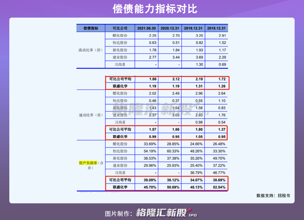 报告期内,联盛化学资产负债率呈波动下滑趋势,从2018年的52.54%降至2021年上半年的45.70%。但由于期间同行业平均值保持38%左右,联盛化学资产负债率较高。
