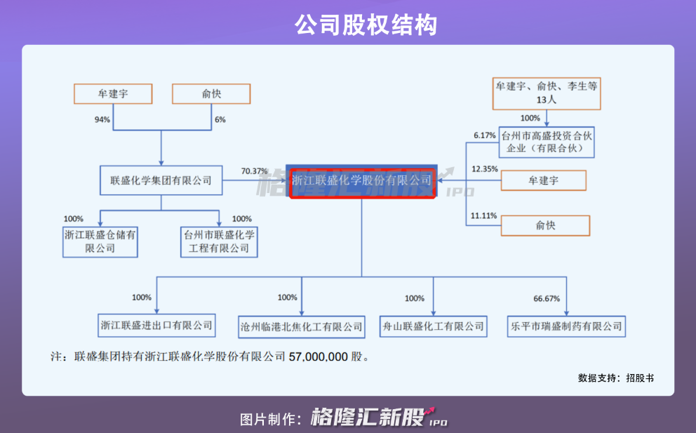 IPO前,联盛集团为公司控股股东,俞小欧、牟建宇夫妻及其女俞快三人为实际控制人。牟建宇、俞快母女二人通过直接持股或间接控制联盛集团、台州高投,合计共控制联盛化学 95.80%的股权。俞小欧未持有公司股份,但是系公司的原始创始人。联盛化学是一家典型的家族控股企业。