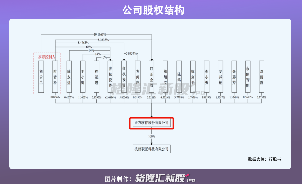 正方软件前身系正方有限自1999年成立,于2009年变更为股份有限公司。IPO前,青松投资为其控股股东,持股62%;叶青松与刘云兰夫妻二人为实际控制人,通过直接或间接控制青松投资、红正企管合计控制正方软件73%的股份。正方软件是典型“夫妻店”模式。