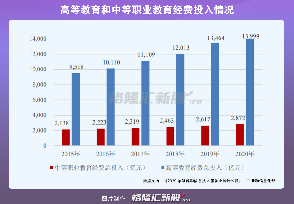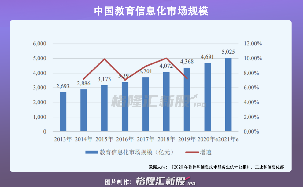 聚焦正大软件所处的教育信息化行业,近年来,伴随着国家持续加大对高等院校的经费投入,从2015年的1.17亿元增加至2020年的1.69亿元,我国教育信息化市场规模逐年攀升,从2013年的2693 亿元扩大至2020年的4691亿元,并预计到2021年将进一步增至5025 亿元。