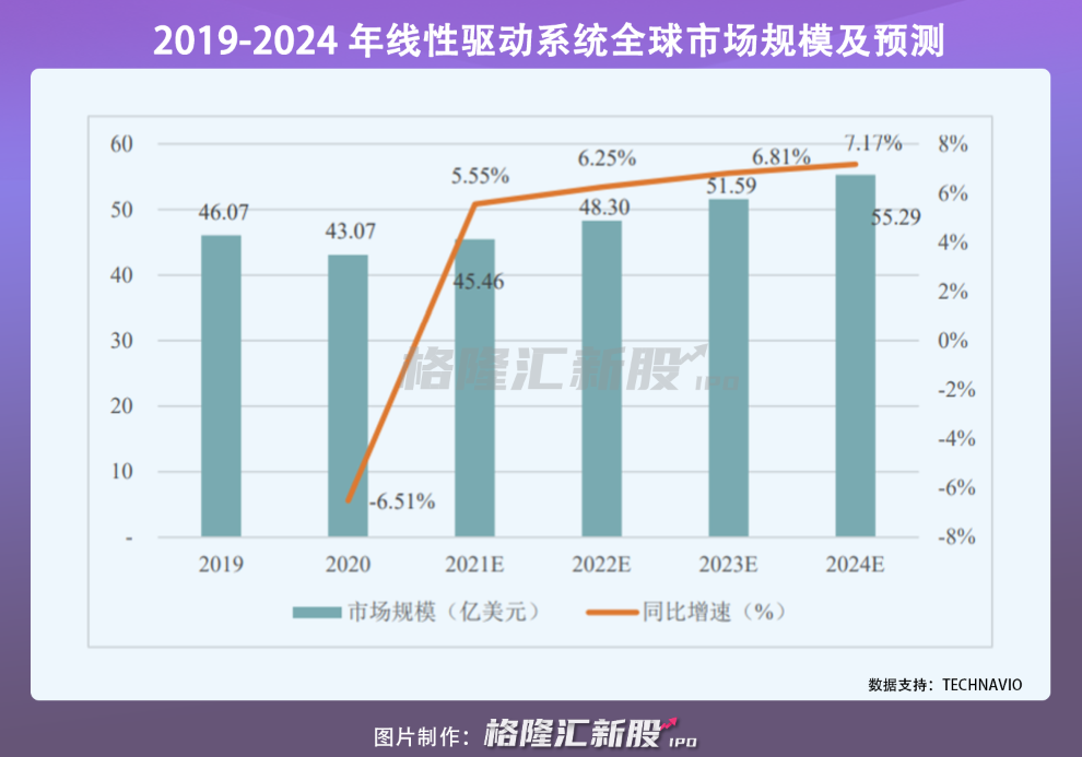 近年来,随着全球电动化、物联网技术的发展,人口老龄化加剧以及用户消费升级趋势深入,为行业提供技术和需求支撑,全球智能线性驱动行业市场发展潜力大。2019年行业市场规模达46.07 亿美元。虽然受疫情影响,2020年增速有所下降,但是预计 2019至2024 年仍可实现 3.72%的年复合增长,并且于2024年市场规模增至55.29 亿美元。