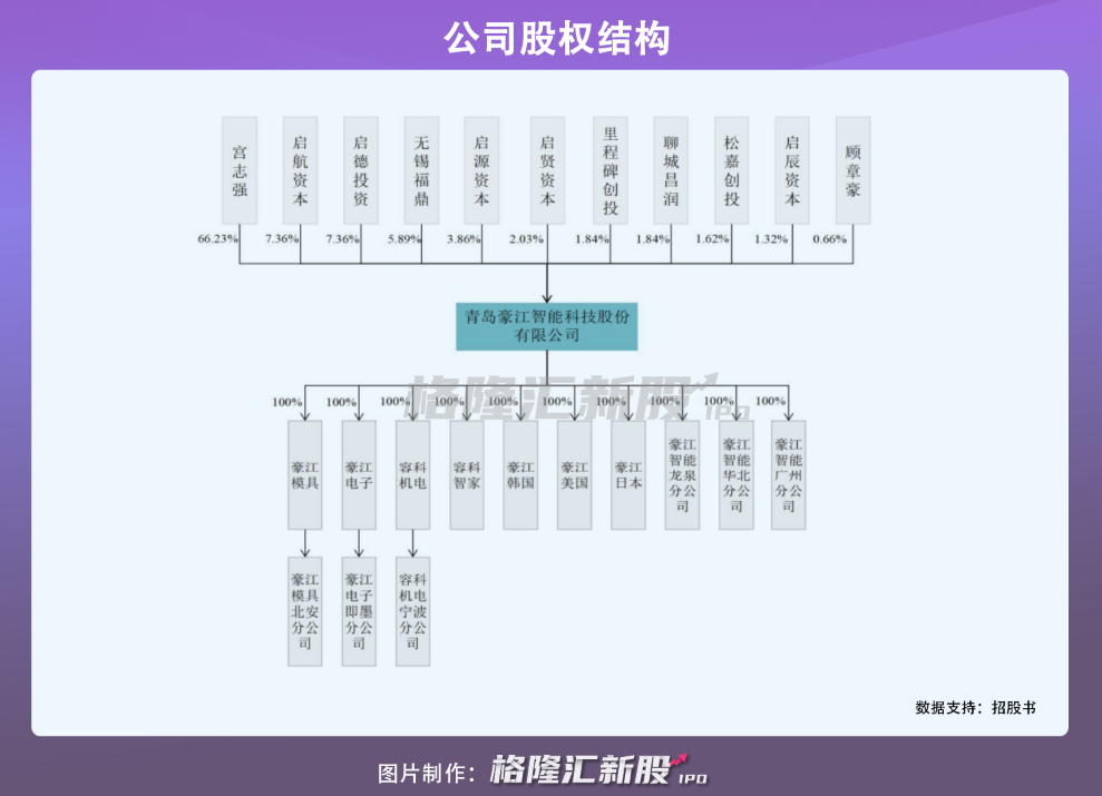 成立4年以来,豪江智能进行了5次增资。其中在递交IPO申请前一年内,获启辰资本、松嘉创投等多名股东,以每股12 元的入股价格突击入股。截至招股书签署日,创始人宫志强为公司实际控制人和控股股东,直接持股66.23%,通过青岛启航和启德投资间接控制14.72%的股份,合计控制80.95%的股份。