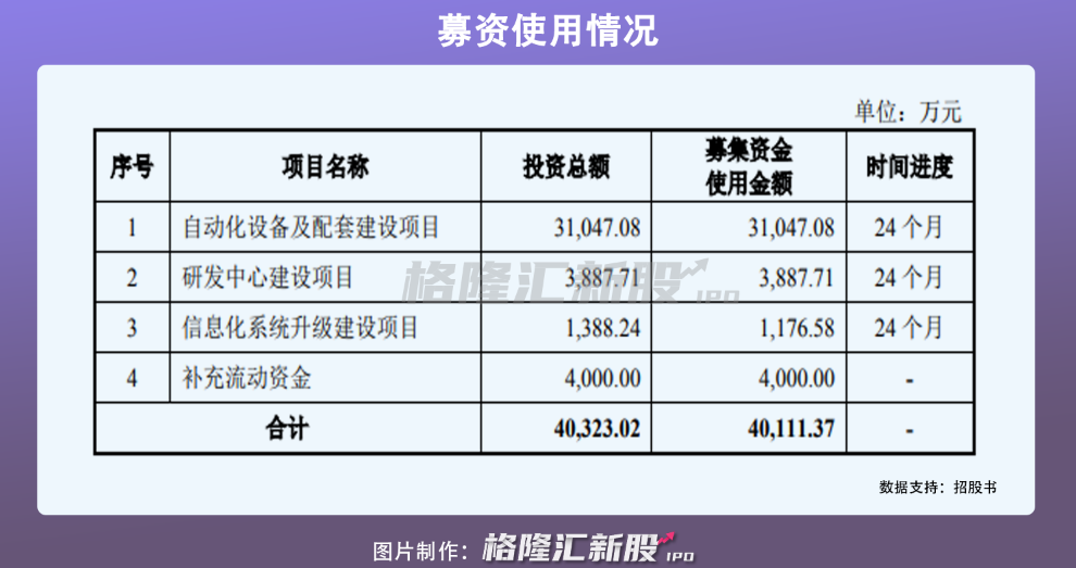 本次IPO拟募集资金4.01亿元,主要将用于自动化设备及配套建设项目、研发中心建设项目、信息化系统升级建设项目和补充流动资金。