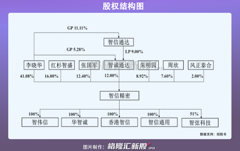 根据招股书,公司实际控制人为李晓华。李晓华直接持有公司41.08%股权,通过担任智诚通达普通合伙人间接控制智信精密 12.00%股权,合计控制智信精密 53.08%股权。