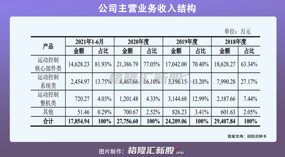 其中,运动控制核心部件类贡献公司绝大部分收入来源,占比由2018年的63%提升至2020年的77%,今年上半年进一步提升至82%。而相对的运动控制系统类、运动控制整机类近年来收入规模震荡下行,占比也处于萎缩状态。