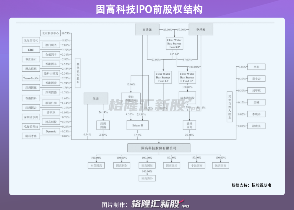 IPO前,固高科技股权比例分散,任一单一股东的持股比例均不超过30%,因此公司不存在控股股东。其第一大股东为香港固高,持股占比25.36%。公司的实际控制人为李泽湘、高秉强和吴宏,三人签订了《一致行动协议》,直接和间接持有公司30.84%的股份,并控制合计32.30%的表决权。