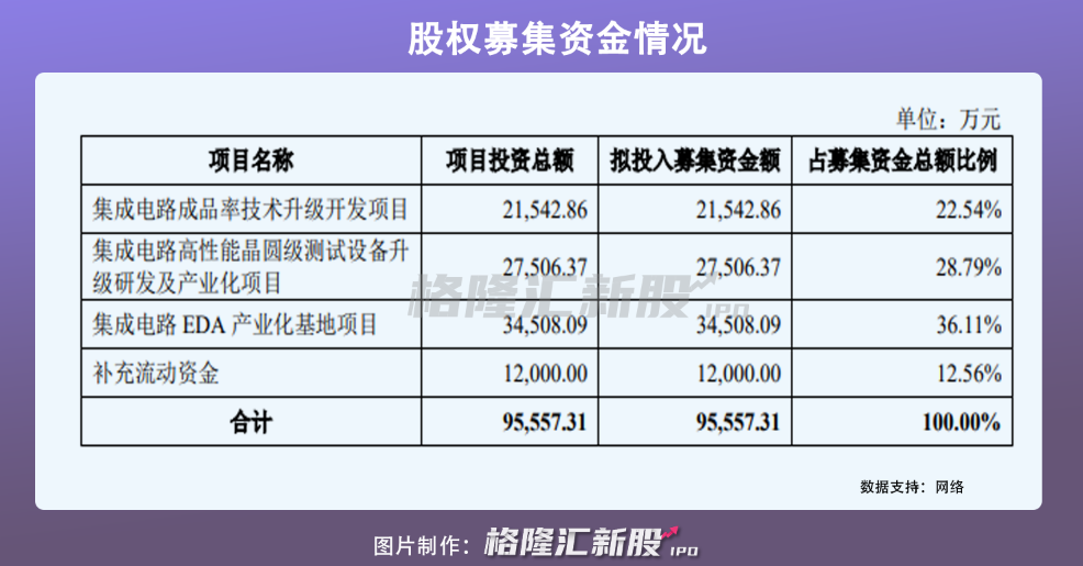 本次IPO拟募资9.56亿元,主要用于集成电路成品率技术升级开发项目、集成电路高性能晶圆级测试设备升级研发及产业化项目 、集成电路 EDA 产业化基地项目以及补充流动资金。