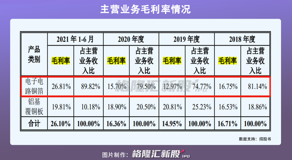 具体来看,2018年以来,因国内电子电路铜箔市场新增产能逐步释放,电子电路铜箔供给量增加。但是2019年受下游行业通信电子正处于 4G 和 5G 的更迭时期,消费者换机欲望下降等影响,终端电子产品需求下降,导致上游电子电路铜箔的需求放缓,致使电子电路铜箔销售单价下降,2019年电子电路铜箔毛利率从16.75%下滑至12.97%,拉低了综合毛利率。