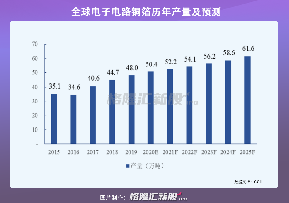 近十年来,受益于全球电子信息产业的长足进步,以及下游应用领域诸如5G、新能源汽车行业发展,以及技术升级和供应链恢复等,PCB 的市场空间在扩大。2020年,PCB市场规模达到了652亿美元。得益于PCB产业发展带动,全球电子电路铜箔需求增长。2015年至2019年,其全球产量从35.1万吨增至48万吨,并预计2025年将进一步上升至61.6万吨。