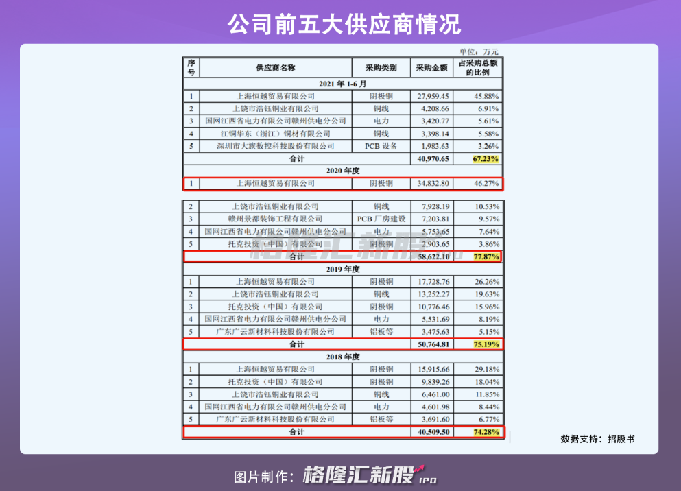 此外,逸豪新材前五大供应商采购相对集中,2018年至2020年其采购占比分别为74.28%、75.19%、77.87%。其中,公司对第一大供应商上海恒越贸易有限公司(以下简称“上海恒越”)采购占比从2018年的29.18%波动上升至2021年上半年的45.88%,其对供应商上海恒越形成一定依赖。