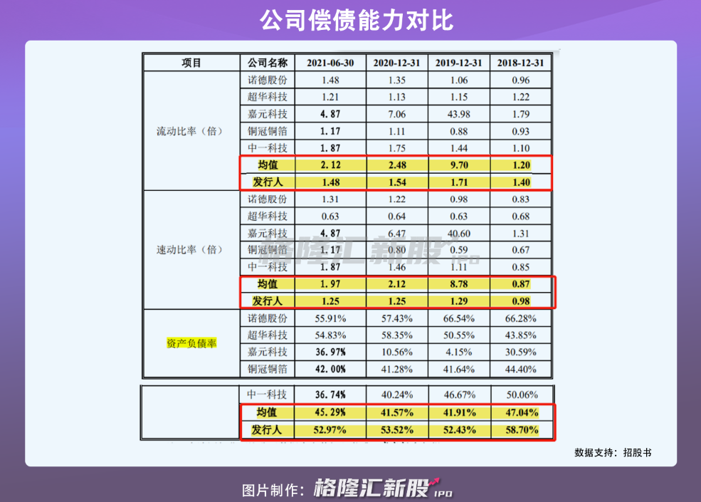 报告期内,随着收入规模的增加,逸豪新材资产负债率在波动下滑,2018年至2021年上半年分别为58.70%、52.43%、53.52%、。但是因融资渠道有限,银行借款较多,截至2021年上半年,其短期及长期银行借款合计有4.71亿元,占负债总额的比例 66.67%,公司资产负债率高于同行。