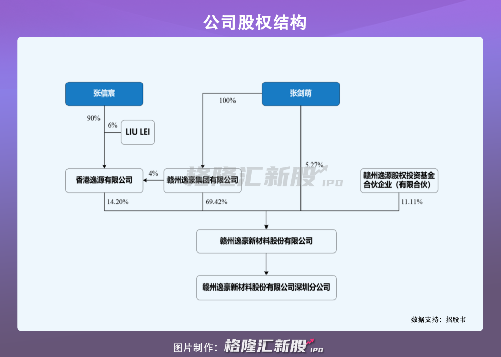 逸豪新材前身是逸豪有限,由逸豪置业与王惠玲在2003年合资设立,2018年12月变更为股份有限公司。IPO前,逸豪集团为公司控股股东,直接持股69.42%。张剑萌、张信宸父子二人为实际控制人,张剑萌直接持股5.27%,并通过逸豪集团间接控制公司69.42%的股份,张信宸通过香港逸源间接持股14.20%,二人合计共控制逸豪新材88.89%的股份。