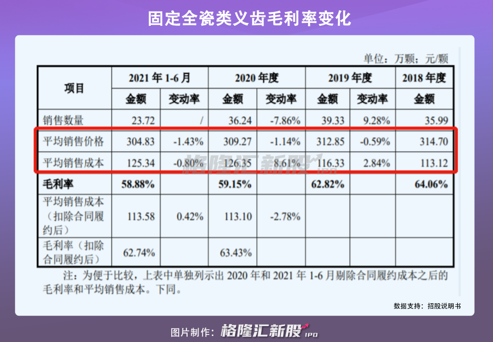 以第一大业务固定全瓷类义齿为例,近年来固定全瓷类义齿的平均销售价格不断下滑,由2018年的314.7元/颗下降至今年上半年的304.83元/颗;而相对的平均销售成本却有所上升,由113.12元/颗增加至125.34%。价格下降,成本上升,进而压缩其毛利率空间。