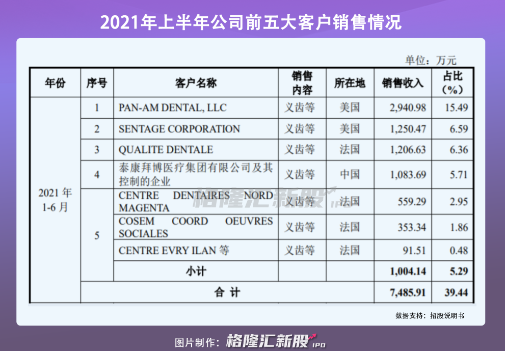 目前,家鸿口腔前五大客户中,仅有拜博医疗为中国企业,其余的均来自美国及法国地区,收入占比较高。