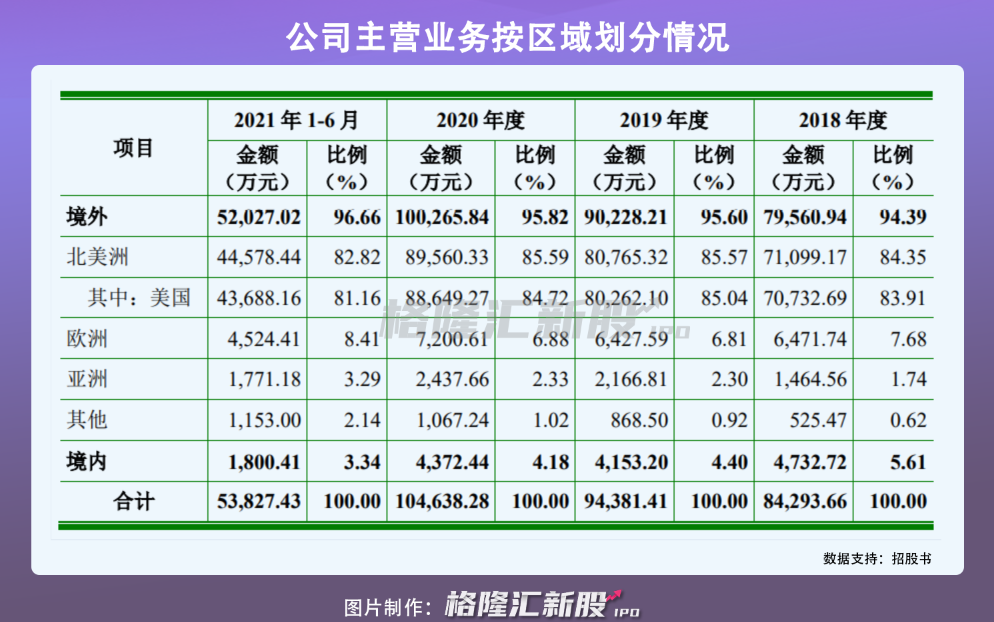 也因此,国内宠物用品企业多以出口为主,例如天元宠物和依依股份,2020年境外销售比例均超过70%。中恒宠物也不例外,报告期内,境外销售占比公司主营业务收入的95%,其中,美国市场的销售收入占比最重,分别为83.91%、85.04%、84.72%和81.16%。