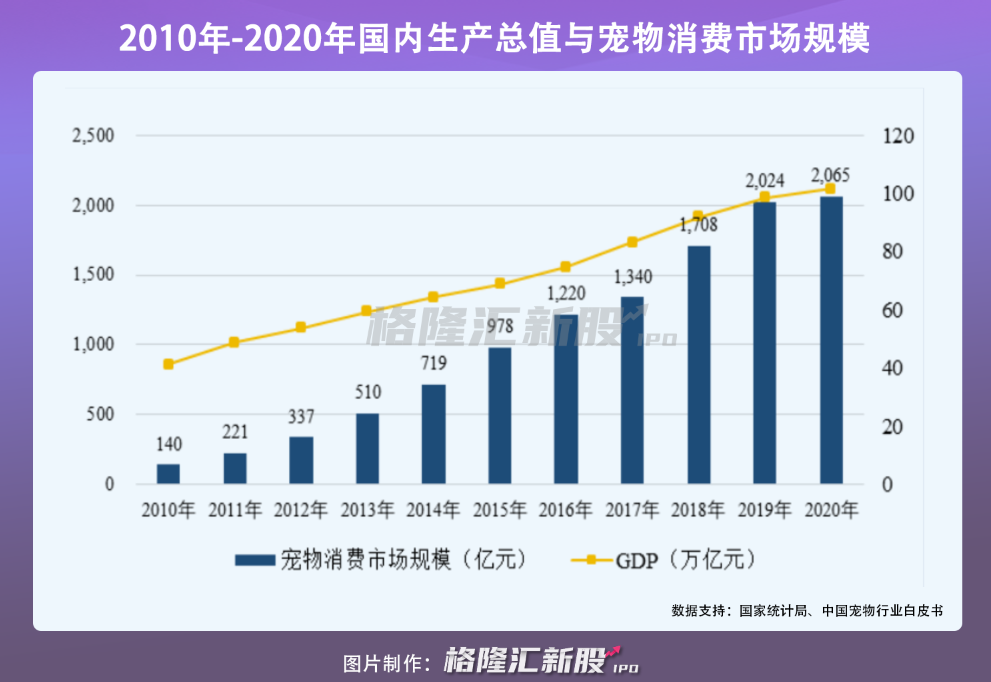 多重因素的推动下,中国宠物行业市场规模不断扩大,由2010年的140亿元快速增长至2020年的2065亿元,复合增长率达30.88%。
