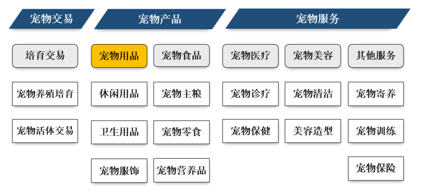 随着市场快速发展,宠物行业资源也逐步整合与分化为培育交易、宠物用品、宠物食品、宠物医疗、宠物美容和其他服务。