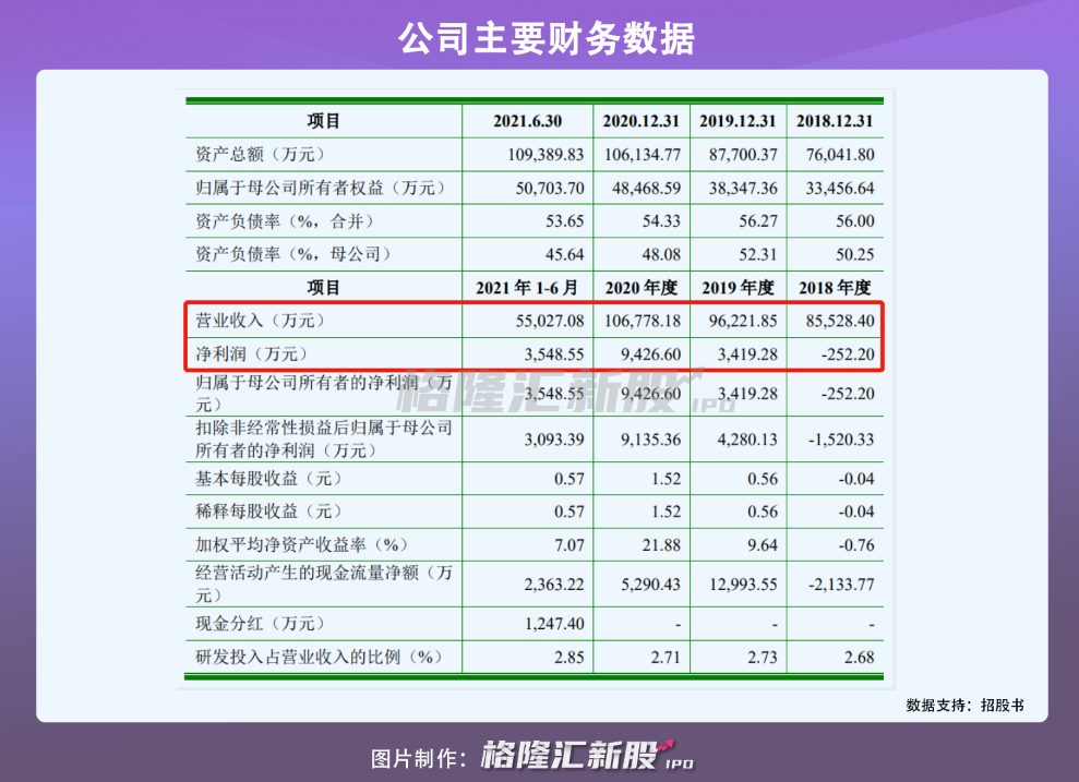 报告期内,公司营业收入为8.55亿元、9.62亿元、10.68亿元和5.5亿元,同期净利润为-252.2万元、3419.28万元、9426.6万元和3548.55万元,2018年至2020年,公司规模持续扩大、盈利能力不断增强。
