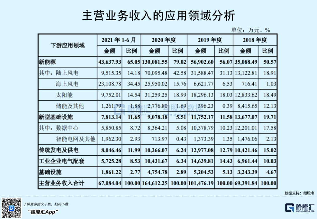 报告期内,公司应用于新能源及新型基础设施领域的主要产品收入合计占公司主营业务收入比例均在7成以上。具体来看,陆上风电、海上风电和太阳能收入占比较高,其中,海上风电收入占比2018年的1.03%上升至2021年上半年的34.45%。