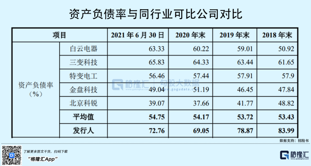 2018年至20201年1-6月报告期内,明阳电气的资产负债率分别为83.99%、78.87%、69.05和72.76%,虽然整体有所下降,但仍远高于同行业可比上市公司平均水平。