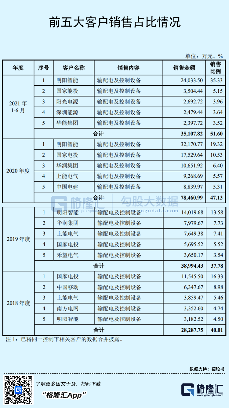 明阳电气主要服务的客户均为新能源行业的知名企业,包括明阳智能、国家能投、阳光电源、深圳能源和华能集团等,但公司的客户较为集中,报告期内前五大客户的销售占比分别为40.01%、37.78%、47.13%和51.60%,占比相对较高。