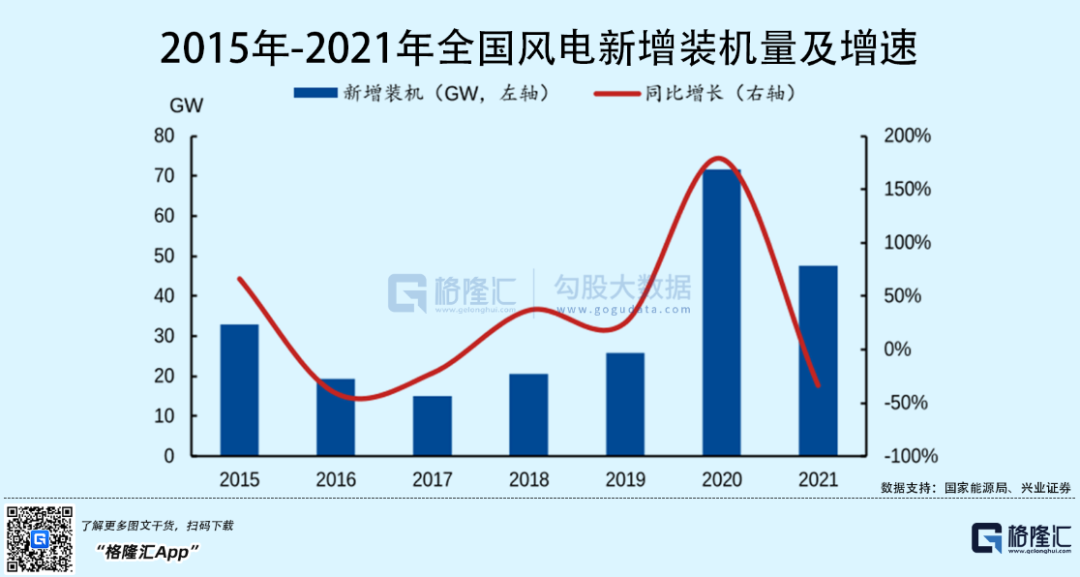 根据中国电力企业联合会统计数据,2020年和2021年我国风力发电新增装机容量分别为71.67 GW和47.6GW,分别同比增长 179%和-34.3%。