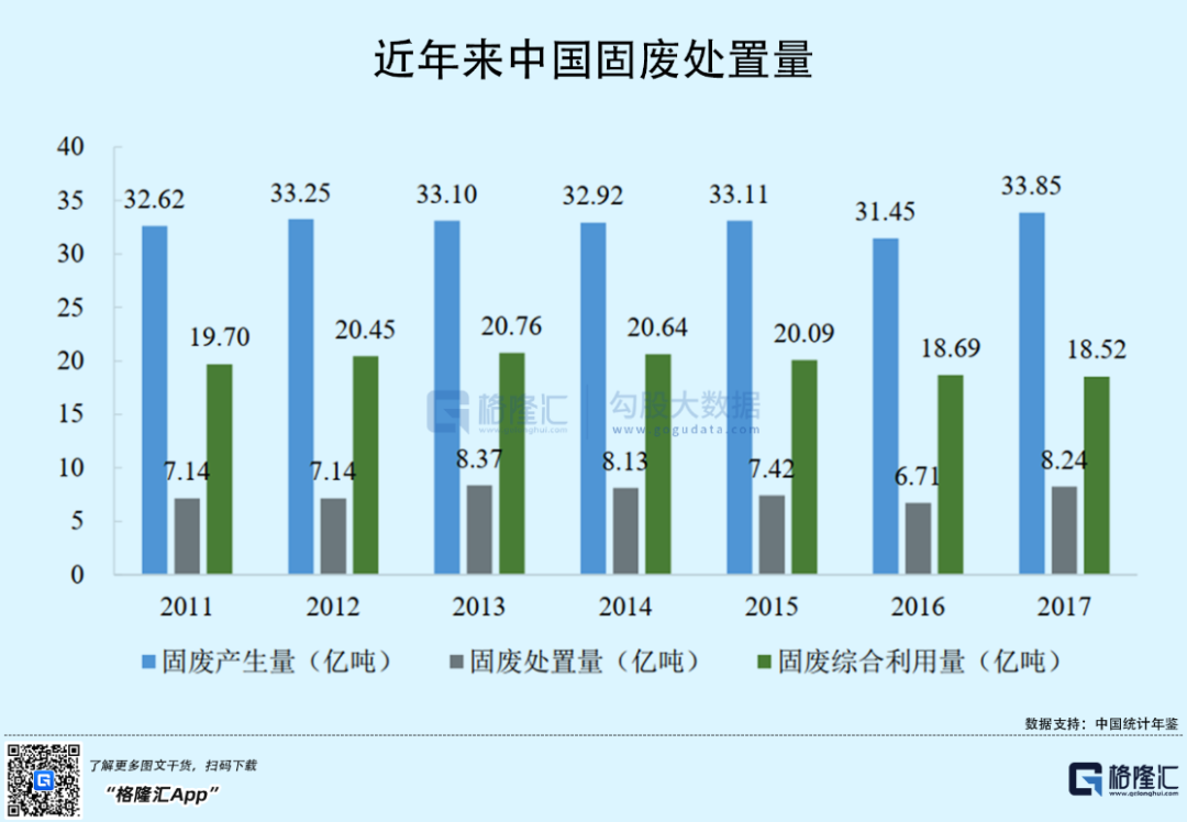 2017年,在环保督察趋严的背景下,大量存量固废释放,拉高了当年的固废产生量和处置量,分别达33.85亿吨和8.24亿吨。同年,中国固废利用处置率(处置量+综合利用量)/产生量)为79.04%,其中,处置率为24.33%,综合利用率为54.72%。