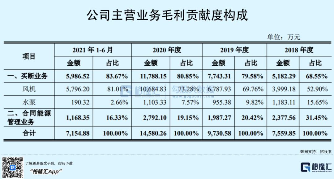 从业务类型来看,瑞晨环保的主营业务毛利主要来源于风机及水泵产品的买断销售收入及合同能源管理收入。其中,报告期内,买断业务的毛利贡献度分别为68.55%、79.58%、80.85%和83.67%,占比较高。