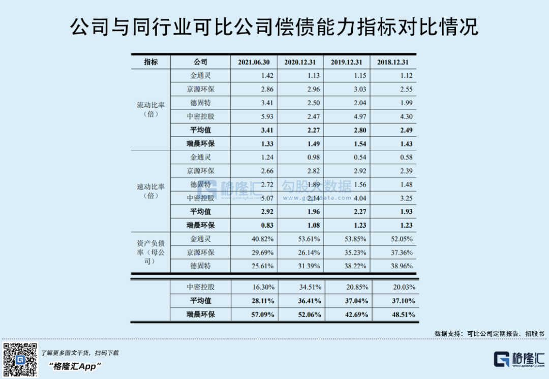 另外值得注意的是,目前瑞晨环保的融资渠道较为单一,资金来源一般是银行借款,因此公司的资产负债率逐年走高,且较可比公司平均水平略高。