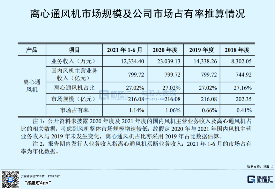 据测算,2018年至2021年1-6月报告期内,瑞晨环保的离心通风机产品市场占有率分别为0.41%、0.66%、1.06%和1.14%,占比较低,但呈现逐年上升的态势。