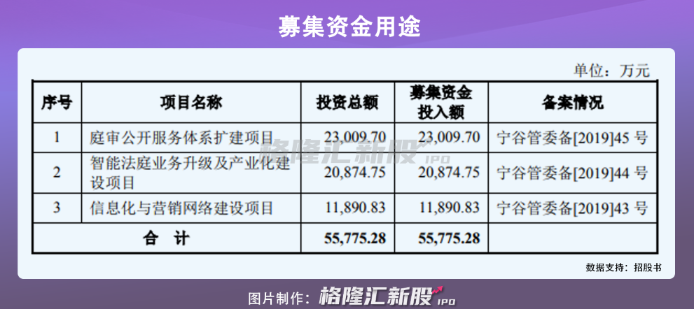 本次IPO计划拟募集资金5.58亿元,其中2.3亿元用于庭审公开服务体系扩建,2.09亿元用于智能法庭业务升级及产业化建设,1.19亿元用于信息化与营销网络建设。