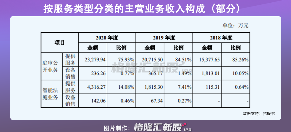 其中,公司的主营业务包括庭审公开、智能法庭和其他智慧法院业务三大类业务。报告期内,庭审公开业务是收入的主要来源,占主营业务收入比例分别为95.31%、86.00%、76.70%。