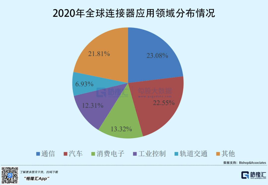 维峰电子所处细分行业为电子元器件行业中的连接器子行业,从应用领域分布来看,通信、汽车、消费电子、工业控制、轨道交通是连接器最主要的应用领域,2020年占比分别为23.08%、22.55%、13.32%、12.31%以及6.93%,合计达78.19%。