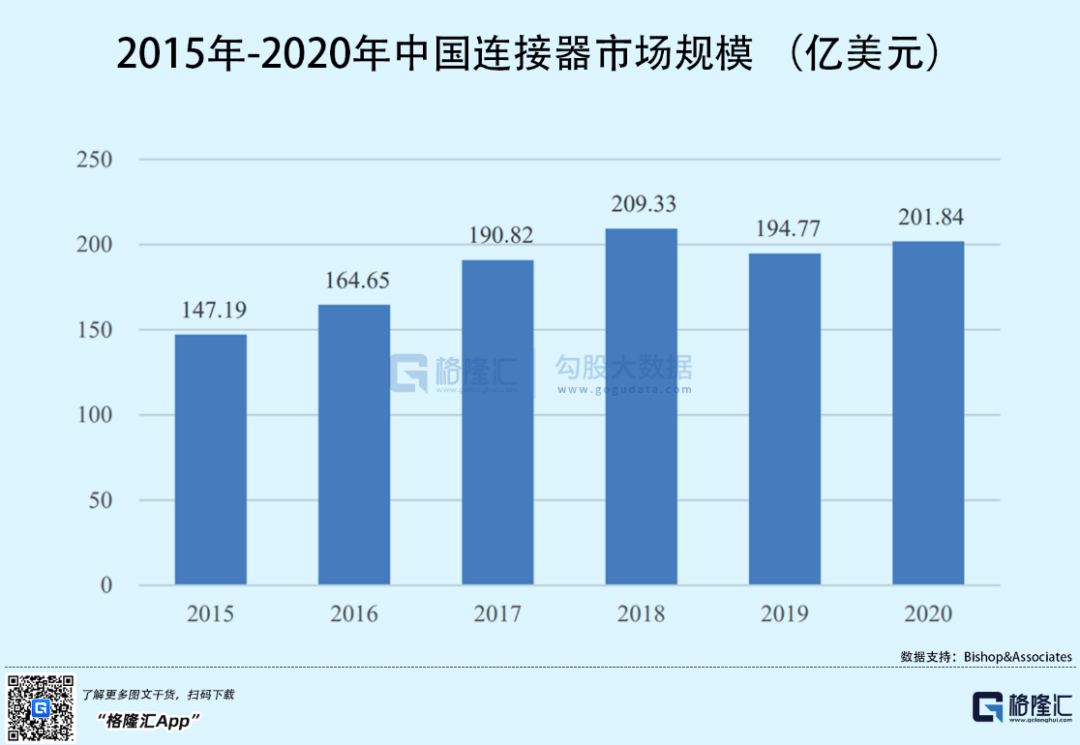 目前中国是全球最大的连接器市场,2020年中国连接器市场份额占全球比例达到32.18%。据统计,中国连接器市场规模从2015年的147.19亿美元增长至2018年的209.33亿美元,而2019年有所下滑,2020年市场规模为201.84亿美元。