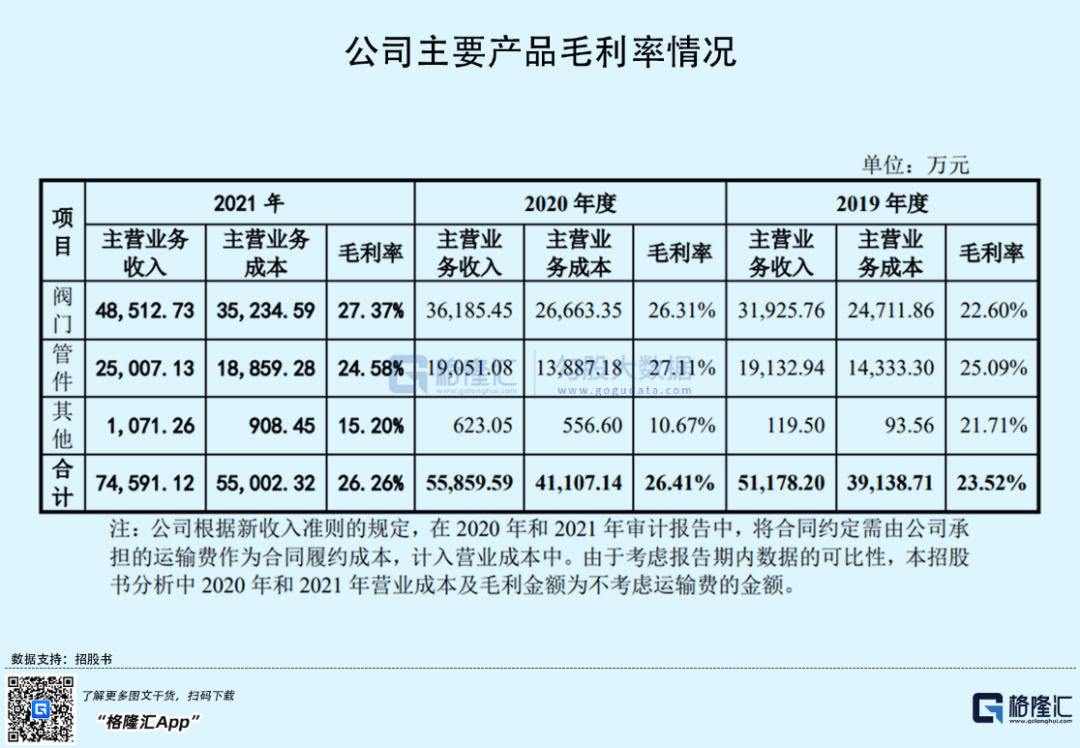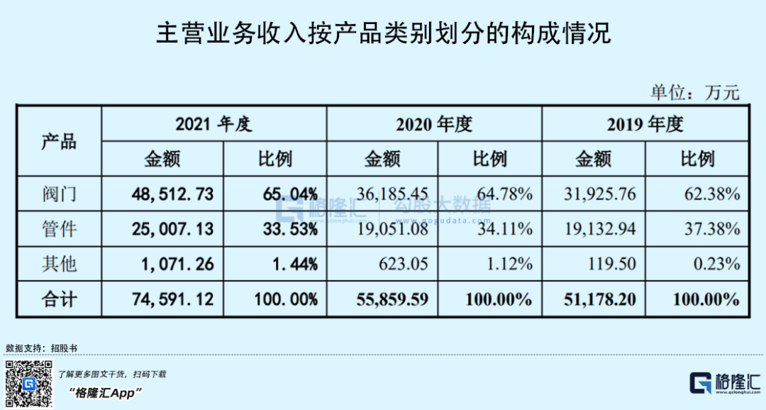 其中,阀门是公司的主要收入来源,其收入金额逐年增长,占比从2019年的62.38%上升至2021年的65.04%。