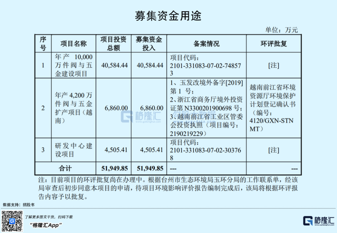 本次公司拟募资5.19亿元,其中4.06亿元用于年产10000万件阀与五金建设项目、6860万元用于年产4200万件阀与五金扩产项目(越南)以及4505万元用于研发中心建设项目。