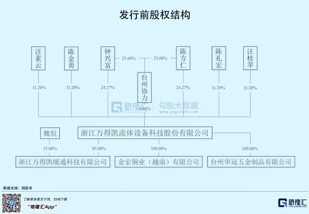截至发行前,万得凯的实际控制人钟兴富、汪素云、陈金勇家庭以及陈方仁、汪桂苹、陈礼宏家庭直接及间接持有公司96.48%的股份。