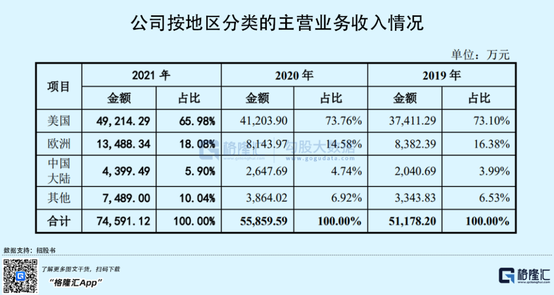 按销售地区来看,目前万得凯产品以外销为主,各国收入中美国业务收入占比最高,报告期内占主营业务收入的比重分别73.10%、73.76%和 65.98%。但公司产品在美国市场的市占率不高,仅为3.17%,还有一定的开拓空间。