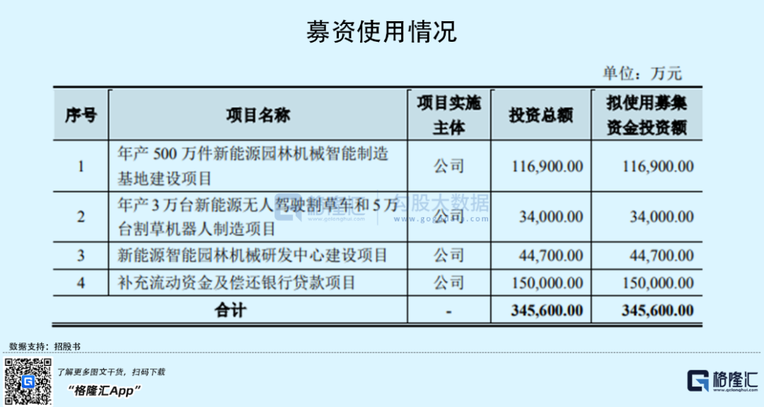 本次IPO拟募资34.56亿元,将投资于“年产 500 万件新能源园林机械智能制造基地建设项目”、“年产 3 万台新能源无人驾驶割草车和 5 万台割草机器人制造项目”、“新能源智能园林机械研发中心建设项目”以及“补充流动资金及偿还银行贷款项目”。