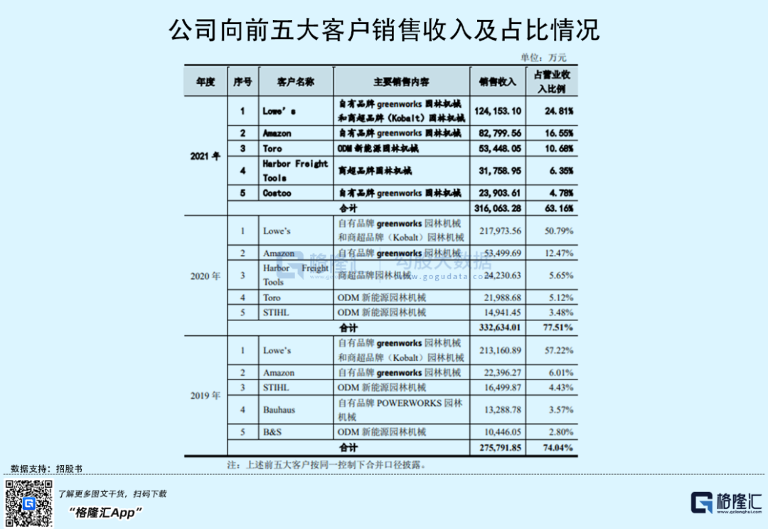目前公司的主要客户为 Lowe’s、Amazon、Costco、The Home Depot、Harbor Freight Tools、CTC、Bauhaus 等大型商超、电商以及 Toro、STIHL、B&S 等行业内知名品牌商。报告期各期,公司前五大客户的销售占比分别为 74.04%、77.51%和63.16%,其中第一大客户Lowe’s的销售占比分别为57.22%、50.79%和24.81%,占比较高。