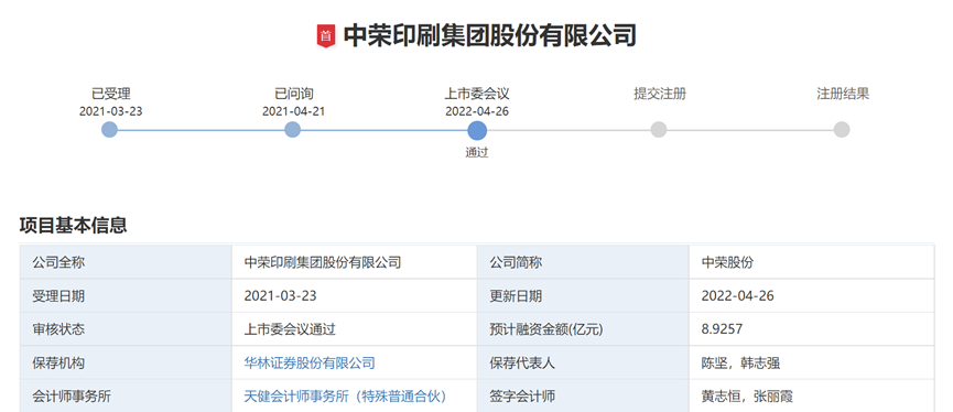 据格隆汇新股了解,中荣印刷集团股份有限公司(以下简称“中荣股份”)于4月26日接受了创业板上市委的审核,结果获通过,其保荐机构为华林证券。